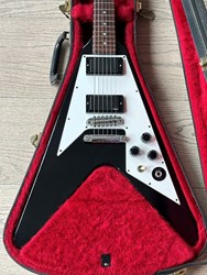 This is a vintage 1976 Gibson Flying V, not a Custom Shop Kirk Hammett model. It's equipped with EMG pickups to match the Metallica sound and vibe. This is a lightweight, easy playing and heavy sounding rock weapon. The original pickups and tuners are gone. The original pots and knobs are included. The guitar is now equipped with Schaller tuners. The black finish has partial overspray. Because the guitar was stored in the case for a long time, the fabric damages the finish on some spots, so it was fixed with some new finish. comes in it's original case.
