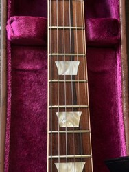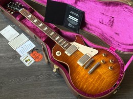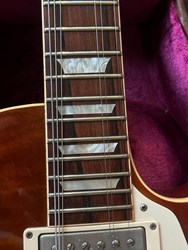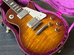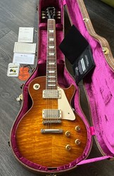 This is a stunning 1959 Historic from the 50th anniversary year 2009. It has an exceptional top with fat flames who also have some quilt in them, it's hard to describe, but it sure is a unique looking guitar from a legendary year. It has Burstbucker 1 and 2 pickups, a nice weight of 3,8kg, very resonant piece of wood with a nice acoustic tone. It has the bumblebees, long neck tenon, the 59 shape neck, all the good stuff. Has some finish dings, but overall in very good condition. Comes with tags, COA and original case.