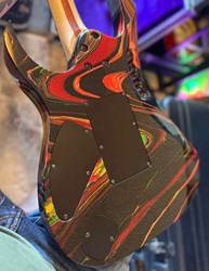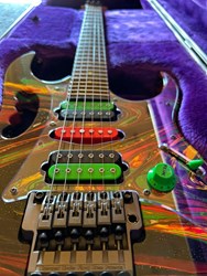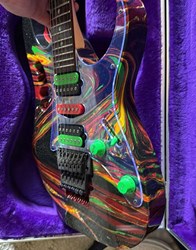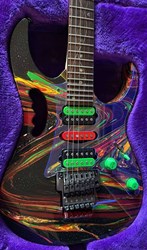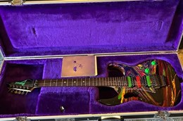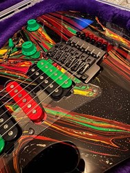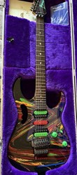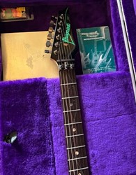 This is the holy grail of JEMs! They come up very rarely, but here you go, this one comes with the flightcase, fleeche bag and certificate. Nice wild swirl and a darker one with milky way black with white spots. The DNA with Steve Vai's own blood in the red paint. Freaky and unique guitar. 300 are made but every one is different because of the unique swirl pattern so you actually have a one off guitar. This one is nr 119 of 300. They were swirled by Darren Johansen of About Time Designs and assisted by DNA concept creator Jim Donahue. At great expense Ibanez flew Darren and all his equipment to Japan for the project that has produced some of the most beautiful guitars ever painted. To get the DNA Steve Vai himself donated a couple pints of blood to be swirled and Darren mixed it liberally. (The blood actually had to be smuggled into Japan because of importation laws) Locked away in a special enclosed “private” section of the factory Darren was assisted by friend and DNA concept creator Jim Donahue. For 10 days they practiced their magic with incredible results.The most notable aspect is the color, as Vai added his DNA (blood) to the mixture of the paint. The painter of the guitar, Darren Michaels/Darren Johansen of ATD (About Time Designs), stated on Jemsite.com, "For the record if you own a DNA you have a good amount of the "DNA". The "blood red" paint that I mixed was mixed at a ratio of approximately 8:1 [paint:blood] so the content is quite high. There had to be pigment mixed into the paint to hold it onto the guitar as well as a carrier”. The guitars were made in the year 2000, represented in the model series, JEM2KDNA (2000). SPECS: JEM2KDNA Body material: American Basswood, Neck Type: Super Wizard Frets 21-24 Scalloped, Neck material: 3-Piece Maple/ Bubinga, Fingerboard: Rosewood, Inlays: Luminous Blue Vine with Green Dots, Frets: 24 / 6105, Neck joint: AANJ, Bridge: Lo Pro Edge tremolo, Hardware color: Powder Cosmo, Pickguard: Illuminant Clear ( BLACK LIGHT ACTIVATED) , PU Config: HSH,Neck PU: DiMarzio Breed, Mid PU: DiMarzio Breed, Bridge PU: DiMarzio Breed, Controls: 1 Volume / 1 Tone / 5-Way lever and a Lo Pro Edge tremolo.