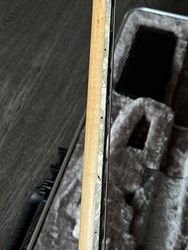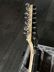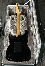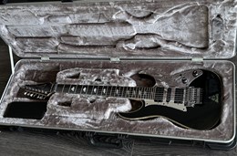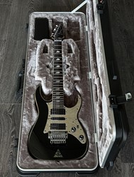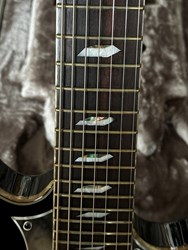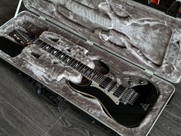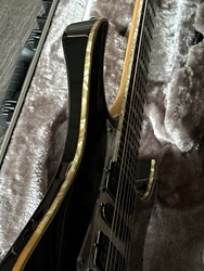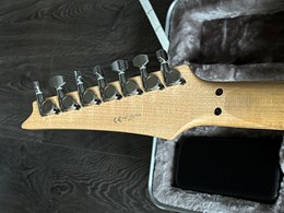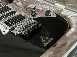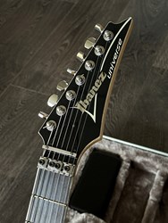 Here is monster sounding 7 string Steve Vai guitar from 2000 with case. As astounding now as it was when it came out, Steve Vai's Universe cuts no corners on tone or looks. Abalone disappearing-pyramid fret marker inlays; a mirror pickguard; Vai's "Light without Heat" pyramid logo below the bridge; plus full body, neck, and head binding provide staggeringly fabulous looks. A double-locking Ibanez recessed trem lets you dip and soar with flawless intonation. DiMarzio Blaze humbuckers at the neck and bridge provide chunky rhythm and dense lead tones while a Blaze single coil in the middle provides brighter, edgier highlights. Basswood body and quartersawn maple neck. 24 fat frets times seven strings on the rosewood board adds up to a Universe of freedom for your fingers. Excellent condition, just very light wear. Comes in a hardcase.
