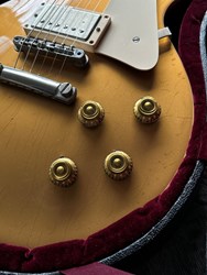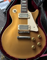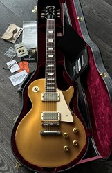 Great sounding and playing Gibson Les Paul Standard 1957 VOS Historic Reissue from the year 2011. It has the right specs like long neck tenon, Vintage CTS potentiometers, round '57 profile neck, bumble bee capacitors, nitro finish and a nice goldtop finish. The guitar has started to age naturally, this is not an aged version, but has checking and playwear in the nitro finish on the top. No cracks or repairs. Comes with COA, tags and original case.