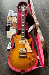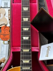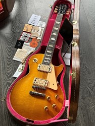 This model is a high-end re-creation of the original 1958 Les Paul Standard. It features premium tonewoods and historic-accurate construction methods. The body is solid mahogany with a two-piece plain maple top. The neck is also mahogany, fitted with an Indian rosewood fingerboard. The finish is nitrocellulose lacquer with a VOS (“Vintage Original Spec”) treatment, meaning it’s lightly aged and buffed to a gently worn appearance rather than a high gloss new look.