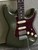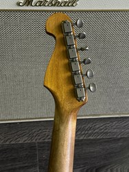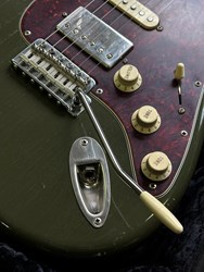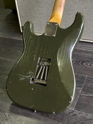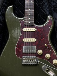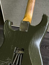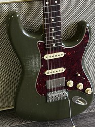 This Strat has a Paulownia body, Kauffmann handwound singlecoil pick-ups, Lollar Imperial PAF, Aged Olive Drab finish, maple neck with indian rosewood board. When strummed acoustic all his guitars are loud and resonant and plugged in its a familiar warm fat strat tone. Weighs just 2,7kg and comes with papers and bag.