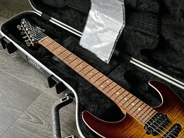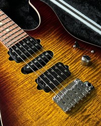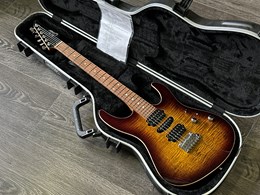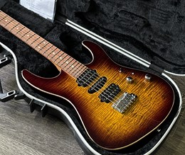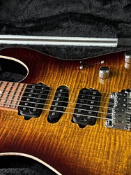 Here is a mint new condition 2024 Suhr Modern with some great specs like a Bengal Burst on a beautiful curly flametop, roasted maple neck, stainless steel frets, SSV neck pickup, V60LP middle pickup and a SSH Plus bridge pickup with 5 way blade switch and push/pull pot for a coil tap on both pickups, Suhr locking tuners, Pau Ferro fretboard etc. Very versatile and comfortable guitar. Great tone in this one. Comes with specsheet and SKB hardcase.