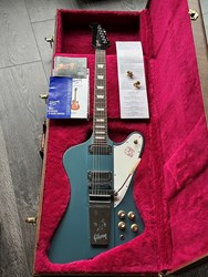 The 2016 Gibson Firebird V in Pelham Blue is a limited-edition model featuring a striking vintage-inspired finish and a Lyre-style Vibrola tailpiece. It combines classic Firebird aesthetics with modern craftsmanship for both stage and studio use.