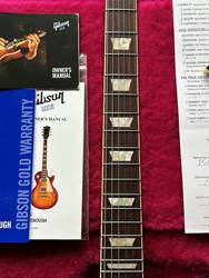 The fingerboard is rosewood, bound, with pearl trapezoid inlays and 22 medium frets. The neck is shaped in a 1960s “Slim” profile, offering a comfortable grip for both rhythm and lead playing.