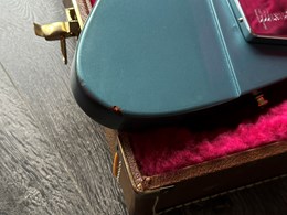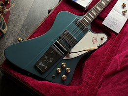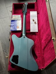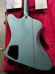 This Firebird has a neck-through body construction, with the neck and body made from mahogany with walnut laminates. The body is finished in Pelham Blue nitrocellulose lacquer, giving it a deep, slightly faded metallic look that enhances the guitar’s vintage vibe.