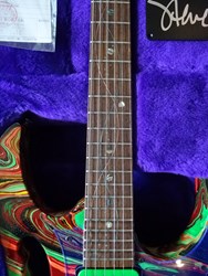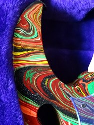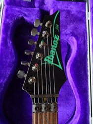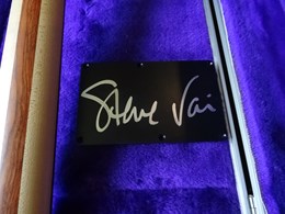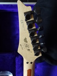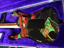 This is the holy grail of JEMs! They come up very rarely, but here you go, this one comes with the flightcase, fleeche bag and signed backplate, the Certificate has been lost by a previous owner. Wild swirl with some darker spots. The DNA with Steve Vai's own blood in the red paint. Freaky and unique guitar. 300 are made but every one is different because of the unique swirl pattern so you actually have a one off guitar. This one is nr 294 of 300. They were swirled by Darren Johansen of About Time Designs and assisted by DNA concept creator Jim Donahue. At great expense Ibanez flew Darren and all his equipment to Japan for the project that has produced some of the most beautiful guitars ever painted. To get the DNA Steve Vai himself donated a couple pints of blood to be swirled and Darren mixed it liberally. (The blood actually had to be smuggled into Japan because of importation laws) Locked away in a special enclosed “private” section of the factory Darren was assisted by friend and DNA concept creator Jim Donahue. For 10 days they practiced their magic with incredible results.The most notable aspect is the color, as Vai added his DNA (blood) to the mixture of the paint. The painter of the guitar, Darren Michaels/Darren Johansen of ATD (About Time Designs), stated on Jemsite.com, "For the record if you own a DNA you have a good amount of the "DNA". The "blood red" paint that I mixed was mixed at a ratio of approximately 8:1 [paint:blood] so the content is quite high. There had to be pigment mixed into the paint to hold it onto the guitar as well as a carrier”. The guitars were made in the year 2000, represented in the model series, JEM2KDNA (2000). SPECS: JEM2KDNA Body material: American Basswood, Neck Type: Super Wizard Frets 21-24 Scalloped, Neck material: 3-Piece Maple/ Bubinga, Fingerboard: Rosewood, Inlays: Luminous Blue Vine with Green Dots, Frets: 24 / 6105, Neck joint: AANJ, Bridge: Lo Pro Edge tremolo, Hardware color: Powder Cosmo, Pickguard: Illuminant Clear ( BLACK LIGHT ACTIVATED) , PU Config: HSH,Neck PU: DiMarzio Breed, Mid PU: DiMarzio Breed, Bridge PU: DiMarzio Breed, Controls: 1 Volume / 1 Tone / 5-Way lever and a Lo Pro Edge tremolo.