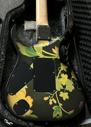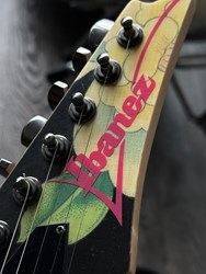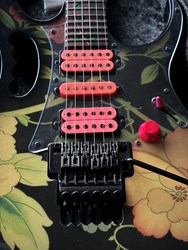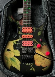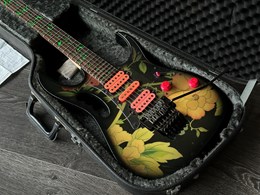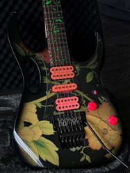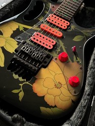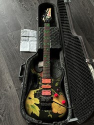 This is a great find, a 1 owner early 1989 JEM 77 FP with original purchase invoice. All original condition. Perfect piece for collectors. The early FP's are amazing guitars, very collectable and more searched for than the later models. The real fabric Floral Graphic is very nice and is even present on the headstock. The original PAF Pro pick-ups sound amazing, from high-gain to funky clean, it is all possible. The tremolo is a monster, almost impossible to get this guitar out of tune, even after many hours of rockin´. The overall condition is very good. The finish has a small ding on the bottom backside, no cracks, replaced parts or repairs. An Ibanez hardcase is included.