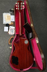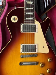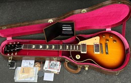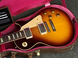 This model is a high-end re-creation of the original 1958 Les Paul Standard. It features premium tonewoods and historic-accurate construction methods. The body is solid mahogany with a two-piece plain maple top. The neck is also mahogany, fitted with an Indian rosewood fingerboard. The finish is nitrocellulose lacquer with a VOS (“Vintage Original Spec”) treatment, meaning it’s lightly aged and buffed to a gently worn appearance rather than a high gloss new look.