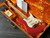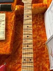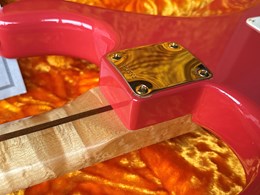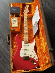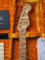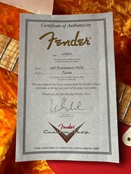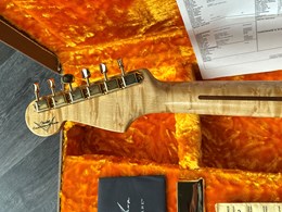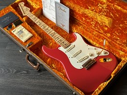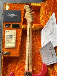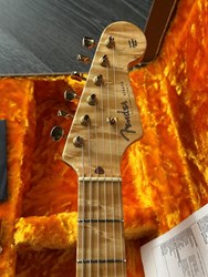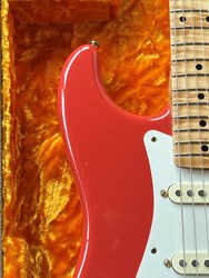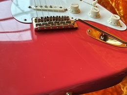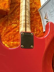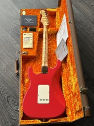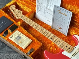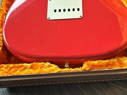 Take a look at the neck on this one, truly stunning blend of flamed and birdseye maple. A Custom Shop 1956 Custom Colour Strat in Fiesta Red finish with Gold hardware. This guitar has such a loud acoustic tone, it rings and sings acoustically. Its has the New Old Stock finish, so as it would have looked in 1956. Year 2010, Alder body, Custom Shop 50s pickups, soft V neck. Good condition, just some dings in the finish of the body, some were touched up by red paint. Comes with COA, Floor traveler and bridge cover in a brown tolex case. The weight is 3,5kg.