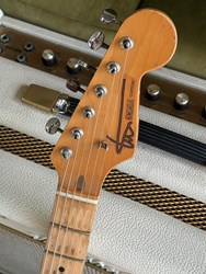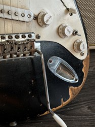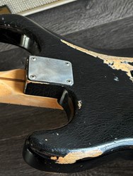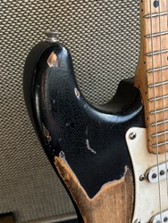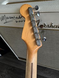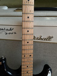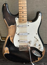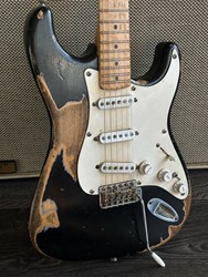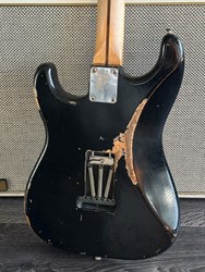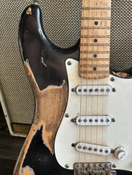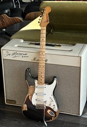 This guitar has an Alder body, maple neck with a dark indian rosewood fretboard, Rebel pickups. It's a 57 inspired with a heavy aged black finish. The middle pot is a tone creator pot and there is also an EMG boost installed. Many sounds in this one. The weight is 3,3kg. Comes in a gigbag.