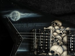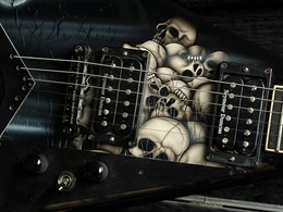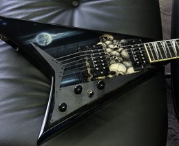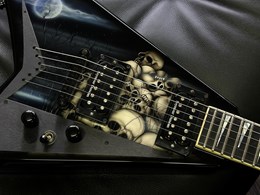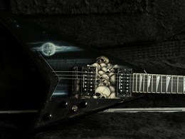 This is a cool one. A neckthrough Jackson USA RR1 with collectable Pile of Skulls graphic. Ebony fretboard, sharktooth inlays, high output SD SH2 and SH4 pickups, string through body and sounds and plays amazing. Lightweight comfortable guitar. Has some light finishwear but overall in very good condition. Comes in the original hardcase.