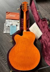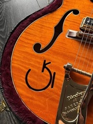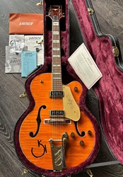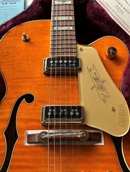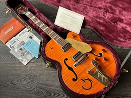 This is an unplayed new guitar from the year 2023. Beautiful flamed maple on this one. Co-designed with the guitarist's guitarist, Chet Atkins, the venerable 6120 is one of the most widely heard Gretsch instruments. The G6120T-55 Vintage Select Edition '55 Chet Atkins® Hollow Body with Bigsby® stays true to the original design and astounding classic aesthetics. A veritable tonal multi-tool, this hollow body has an easy-playing, comfortable feel and rings out proudly with That Great Gretsch Sound!™