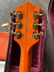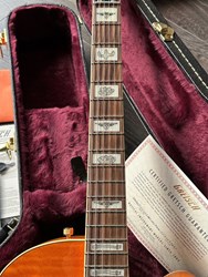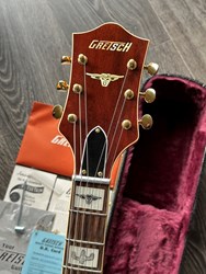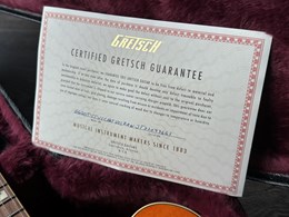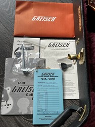Designed for pure tone and slick, comfortable playing feel, this guitar features the classic appointments Gretsch fans desire - gold G-arrow control knobs, aged white binding with black purfling, durable gloss nitrocellulose lacquer finish, aged pearloid block inlays with classic Western motif, gold vintage thick plexi pickguard with Gretsch logo and gold Grover® Sta-Tite™ tuning machines. A resurrected blast from the past with elegantly refined style and sound, the G6120T-55 Vintage Select Edition '55 Chet Atkins® Hollow Body with Bigsby® is sure to satisfy any devotee of Gretsch's golden era.