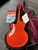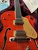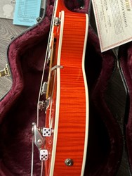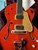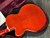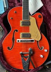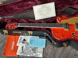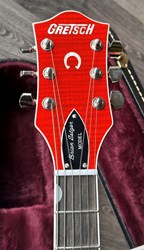 The G6120TFM in Orange Stain duly impresses with a period-correct gold pickguard shape, size and bracket, white body and neck binding, nickel hardware and G-arrow knobs.
