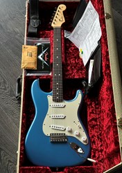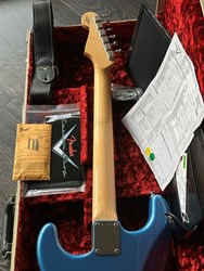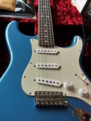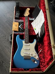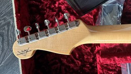 Here is a wonderful Custom Shop 1963 NOS New Old Stock. Not a relic, but this is how a 1963 would looked like if it left the factory in 1963. Shiny finish. This guitar is from 2020 and has a unique combintion of specs, it has the strong 69 pickups, Alder body, a comfortable 9.5 radius and an 59 C shape neck. The nitro finish let's the wood breath as it should. Resonant guitar with a great fat tone. The weight is 3,6kg. Comes with all case candy, COA and original brown tolex case.