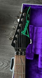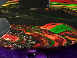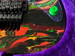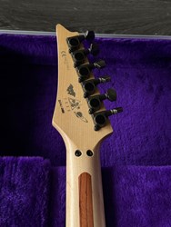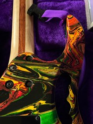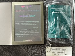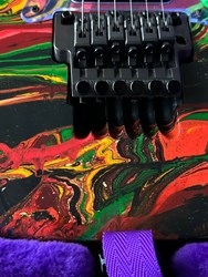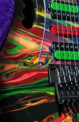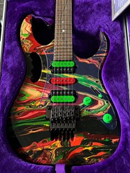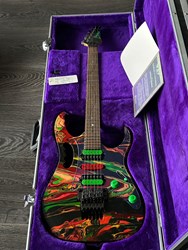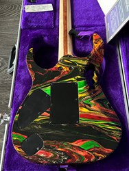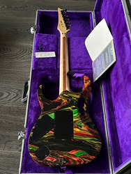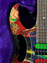 They were swirled by Darren Johansen of About Time Designs and assisted by DNA concept creator Jim Donahue. At great expense Ibanez flew Darren and all his equipment to Japan for the project that has produced some of the most beautiful guitars ever painted. To get the DNA Steve Vai himself donated a couple pints of blood to be swirled and Darren mixed it liberally. (The blood actually had to be smuggled into Japan because of importation laws) Locked away in a special enclosed “private” section of the factory Darren was assisted by friend and DNA concept creator Jim Donahue. For 10 days they practiced their magic with incredible results.The most notable aspect is the color, as Vai added his DNA (blood) to the mixture of the paint. The painter of the guitar, Darren Michaels/Darren Johansen of ATD (About Time Designs), stated on Jemsite.com, "For the record if you own a DNA you have a good amount of the "DNA". The "blood red" paint that I mixed was mixed at a ratio of approximately 8:1 [paint:blood] so the content is quite high. There had to be pigment mixed into the paint to hold it onto the guitar as well as a carrier”. The guitars were made in the year 2000, represented in the model series, JEM2KDNA (2000). SPECS: JEM2KDNA Body material: American Basswood, Neck Type: Super Wizard Frets 21-24 Scalloped, Neck material: 3-Piece Maple/ Bubinga, Fingerboard: Rosewood, Inlays: Luminous Blue Vine with Green Dots, Frets: 24 / 6105, Neck joint: AANJ, Bridge: Lo Pro Edge tremolo, Hardware color: Powder Cosmo, Pickguard: Illuminant Clear ( BLACK LIGHT ACTIVATED) , PU Config: HSH,Neck PU: DiMarzio Breed, Mid PU: DiMarzio Breed, Bridge PU: DiMarzio Breed, Controls: 1 Volume / 1 Tone / 5-Way lever and a Lo Pro Edge tremolo.