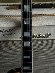 The pots were changed to newer Gibson pots, knobs are changed to speedknobs, pickguard is gone, bridge, tailpiece and pickups are changed for chrome ones, but the pickups are vintage T tops. Bridge wheels and tuners are still the original gold ones. The weight is 5kg. Comes in a non Gibson hardcase.