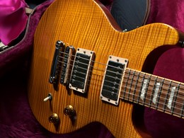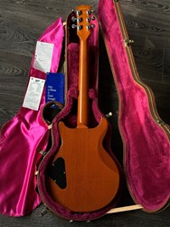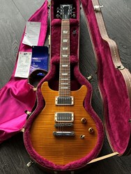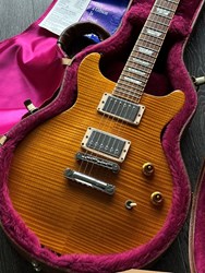 Here is a very good and comfortable playing Les Paul Standard DC from 1998. Very nice flametop. The old woods really help the tone, sweet vintage familair LP sound. Classic 57 pickups, All solid mahogany and maple top, 24 frets. Medium profile neck. Good condition, but has some finish dings and scratches. The checklist and original hardcase are included.