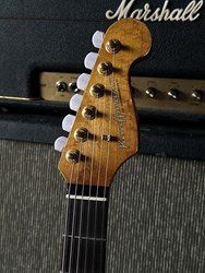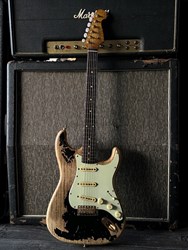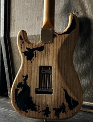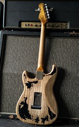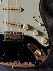 Handbuilt with selected woods for weight and resonance (this one weighs 2,6kg), Paulownia body, gold hardware, handwound mid scooped pick-ups, pearl tuner buttons, dark rosewood fretboard with 9.5 radius, ultra heavy aging inspired by Black1, high-end hardware by CTS, CRL and Switchcraft. Numbered, handsigned and quality checked by the Kauffmann Boss.