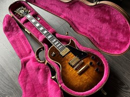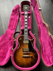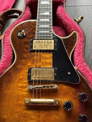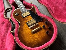 This is beautiful Gibson LP Custom with a rare figured top. It also has a nice weight of 4,2kg and comes in the original case. The Les Paul Custom is based on the model from the 1950s. The body is crafted with a hand-carved maple top, which is fitted to a body made from a solid piece of mahogany. The 24 ¾-inch scale length neck is maple and then topped by a 22-fret Ebony fingerboard outfitted with pearl block inlays and given Gibson’s traditional slim to medium profile. Lovely warm and bluesy les paul sound. Rocks good too and sustains for days. Other appointments include Gibson’s legendary Nashville Tune-o-matic bridge and stopbar tailpiece, metal tulip tuners, multi-ply white and black binding on both the top and back, gold hardware and a 1 11/16” nut width. The finish and hardware has some playwear but overall in very good shape.