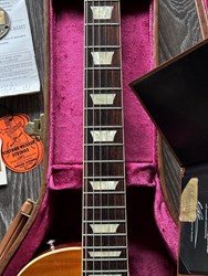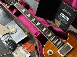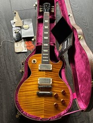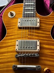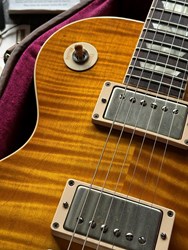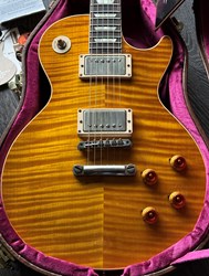 This is a beautiful 1959 VOS. Very fat flametop on this one. The 1959 Les Paul Standard VOS from Gibson Custom represents the origin of the most desirable electric guitar in the history of rock, rendered with all the essential features and every ounce of the tone that made the originals famous. Crafted with the previous generation of Gibson Custom Historic Specifications for vintage-certified looks, tone and feel, this guitar uses select tonewoods, an accurate '59 neck profile, long neck tenon, bumblebee caps, two outstanding Alnico III Custom Bucker pickups, delivering the best of a priceless Les Paul in a guitar you can enjoy today. Very good condition, but there is finish checking on front and back. The weight is 3877 gramms, the year is 2016. Comes with COA and original case.