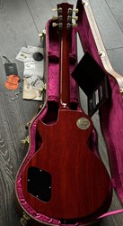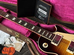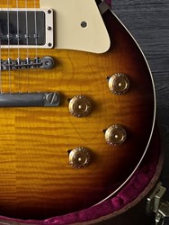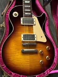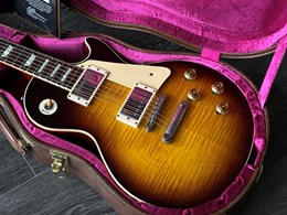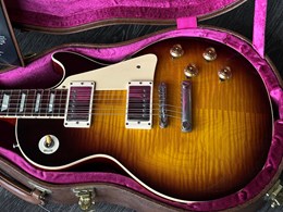 This model is a high-end re-creation of the original 1958 Les Paul Standard. It features premium tonewoods and historic-accurate construction methods. The body is solid mahogany with a two-piece flamed maple top. The neck is also mahogany, fitted with an Indian rosewood fingerboard. The finish is nitrocellulose lacquer with a VOS (“Vintage Original Spec”) treatment, meaning it’s lightly aged and buffed to a gently worn appearance rather than a high gloss new look.