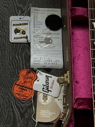 The neck profile is the chunky ’50s “C” style, giving a full, comfortable feel. Frets are narrow-tall (historic style) and are Plek-machine leveled for enhanced playability. Electronics are true to form: two Custombucker (unpotted) deliver rich, vintage-style tones with clarity and resonance. Hardware includes vintage-style Kluson tuners, an ABR-1 bridge with a lightweight aluminum stop tailpiece, and other historically correct appointments throughout.