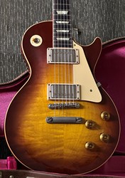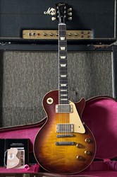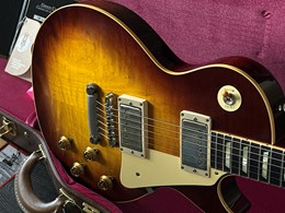 This model is a high-end re-creation of the original 1958 Les Paul Standard. It features premium tonewoods and historic-accurate construction methods. The body is solid mahogany with a two-piece plain maple top. The neck is also mahogany, fitted with an Indian rosewood fingerboard. The finish is nitrocellulose lacquer with a VOS (“Vintage Original Spec”) treatment, meaning it’s lightly aged and buffed to a gently worn appearance rather than a high gloss new look.